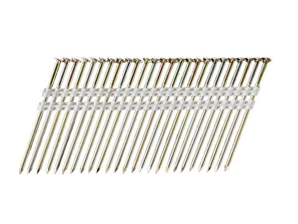 Clous assemblés en plastique, Également connu sous le nom de clous de bande en plastique ou de clous d'encadrement en plastique assemblés, sont le type le plus économique de clous d'encadrement. Les clous sont maintenus ensemble avec une bande ou une bande en plastique pour éviter toute détérioration due aux conditions météorologiques ou à une humidité élevée. La collation sont pêchées pour adapter aux têtes de recouvrement, et les angles sont disponibles dans 0 °, 15 °, 20 °, 21 °, 22 ° et ainsi de suite. Nos clous assemblés en plastique, avec tige lisse, à anneau ou à vis, sont largement utilisés dans la plupart des applications en bois pour fournir un fonctionnement efficace et une excellente puissance de maintien. En outre, il y a des clous assemblés en plastique en acier inoxydable pour le cèdre ou le séquoia pour éviter les taches.